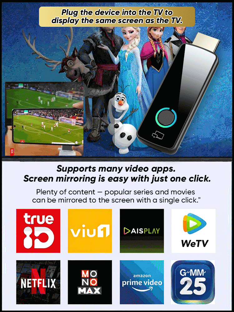 • 【HDCP App Limitations】 Please note: Due to HDCP protocols, certain apps like Netflix and Amazon Prime Video may not support wireless mirroring for copyright protection reasons.
