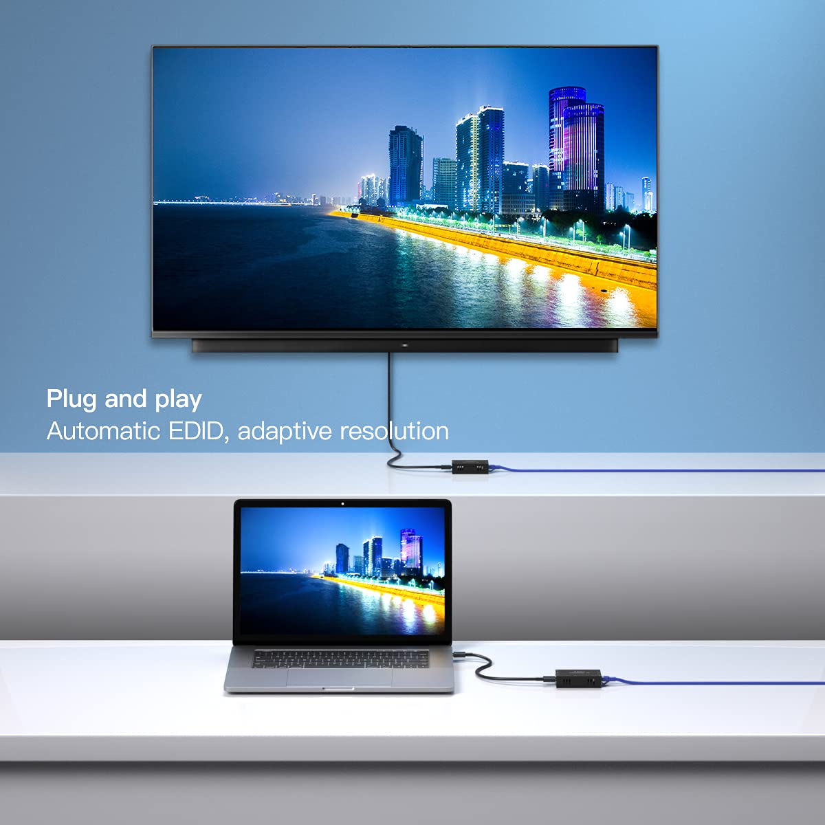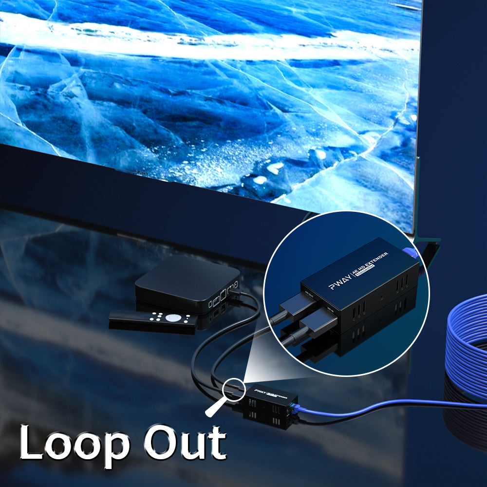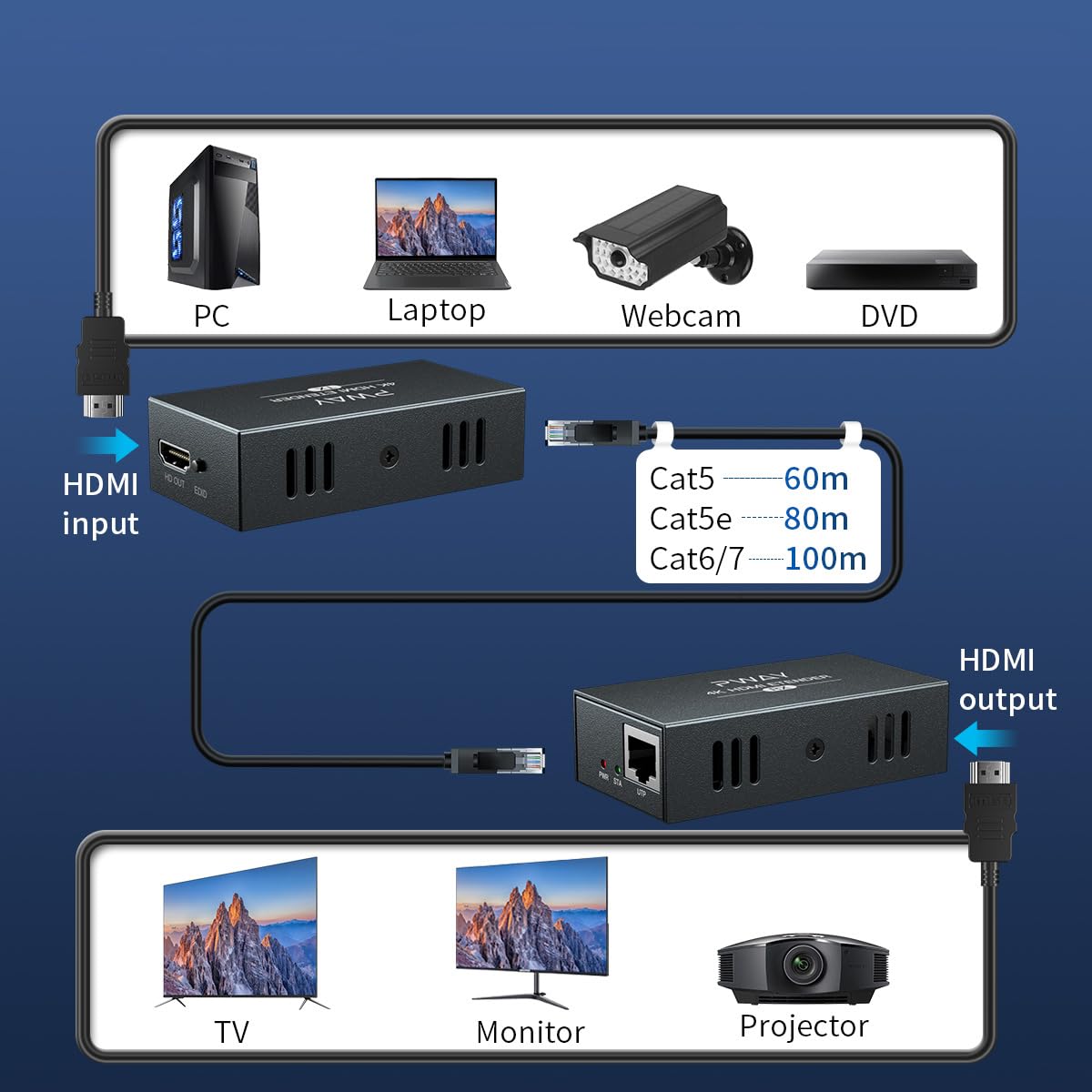 2)HDMI Extender for home audio and video. TV Box---HDMI Transmitter---Ethernet Cable---HDMI Receiver---TV.